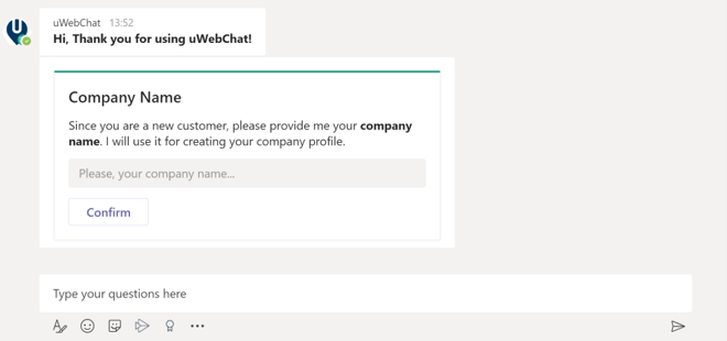 The first time when someone in your tenant starts a conversation with uWebChat, a configuration dialog will appear. Enter your company name in the field as shown below.