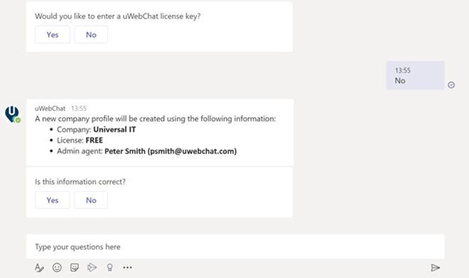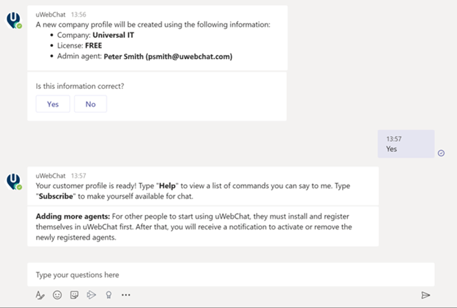 After confirming the entered information, a new company profile will be created. uWebChat has now been configured in your tenant!