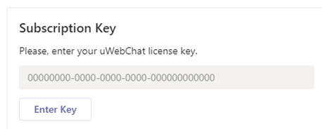 In the image below, an example of a text input rich card is shown. This specific card appears when trying to enter a license key for uWebChat. Interact with it by typing text into the text input field and clicking on the button. Typing text in the regular chat window of Teams will not work for this type of card.